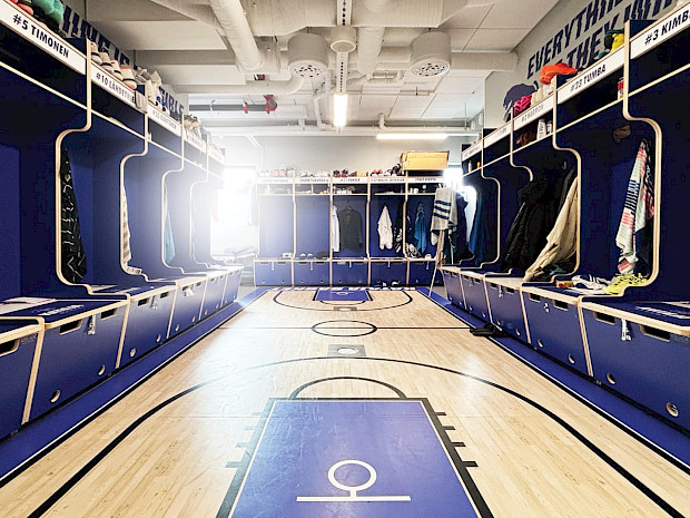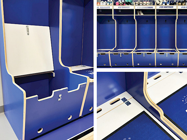 Kalusteet räätälöitiin Katajan väreillä, pintamateriaaleilla ja yksityiskohdilla — mukaan lukien logot, nimikylttipaikat ja johdonmukainen värimaailma. Jokainen pelaaja sai selkeän, yksilöllisen säilytystilan, joka auttaa pitämään tavarat järjestyksessä ja helpottaa päivittäistä käyttöä.