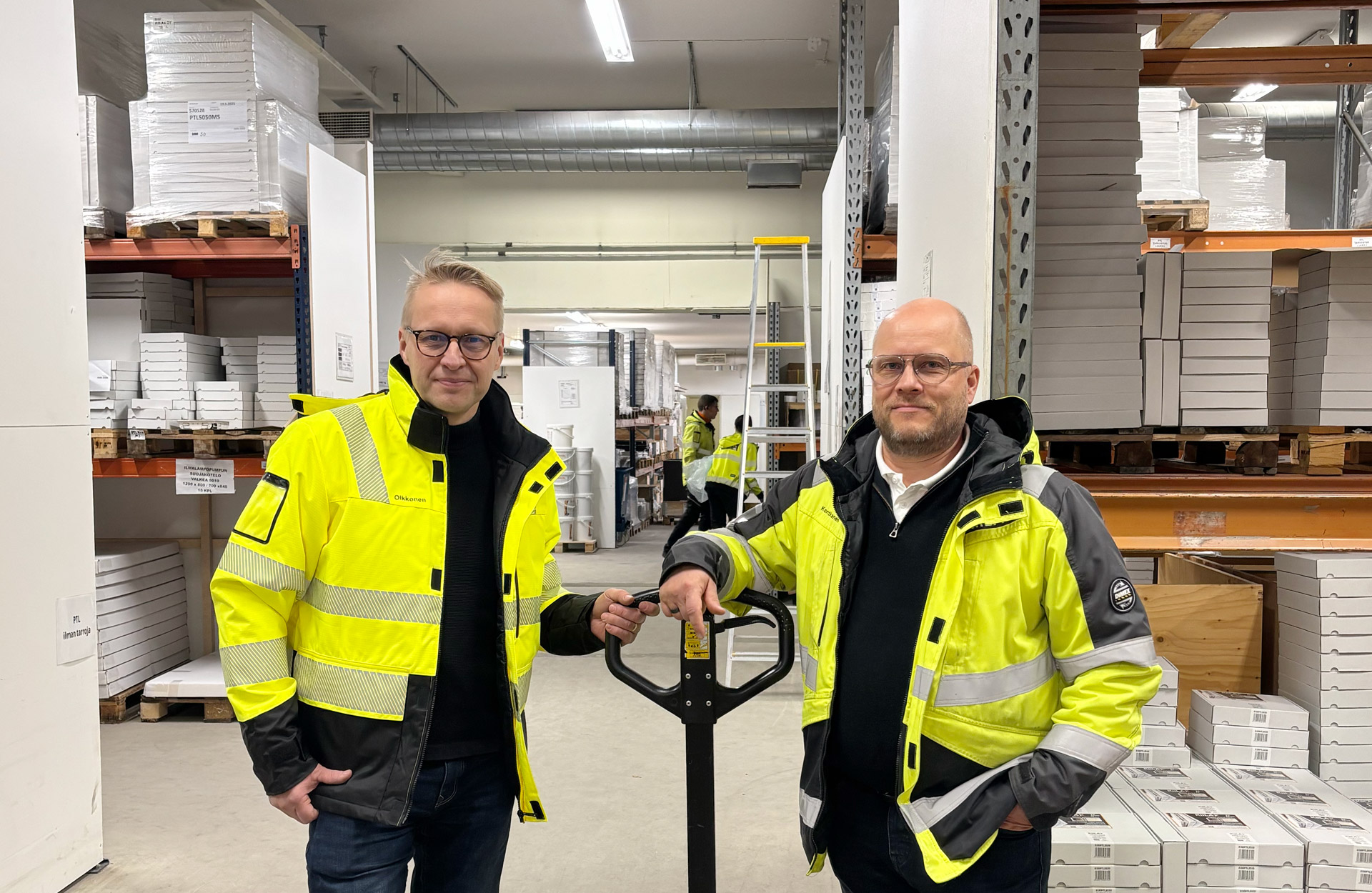 Kuvassa Jani Olkkonen ja Jouni Kontkanen tutustumiskierroksella Kiilaxin toimitiloissa.