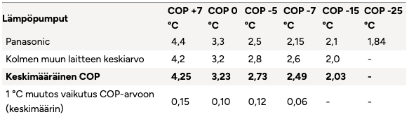 Enligt genomsnittliga COP-tabeller för olika enheter är den procentuella förändringen av samma storleksordning även vid lägre temperaturer än 0 °C, till exempel -5 °C… -25 °C.