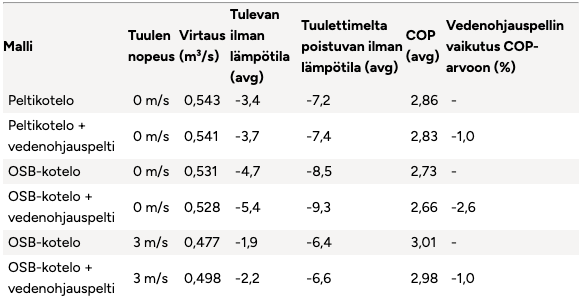 | Modell | Vindhastighet | Flöde (m³/s) | Inkommande lufttemperatur (medel) | Utgående lufttemperatur från fläkten (medel) | COP (medel) | Påverkan på COP (%) |